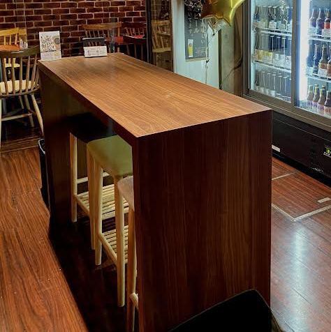 长长的柜台式桌子可以容纳三人并排而坐,或者四人面对面而坐。当您想快速喝一杯时也可以使用它。